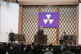 今回は国際教養学科特別任用教授で元学長の飯田 毅先生に、「明日の物語を紡ぐ」と題してお話しいただきました。私たちは他者の物語から多くを学びながら、さまざまな現実や過去の出来事を物語として受けとめ、人生を築いているとお話しされました。また、卒業を迎える学生を送り出す思いを込めて、「ごらんよ空の鳥」を歌われ、最後には、「一人ひとりが人生の主人公となる物語を紡いでいってください。」と学生へあたたかく語りかけ、ご自身のお祈りをもってメッセージを締めくくられました。