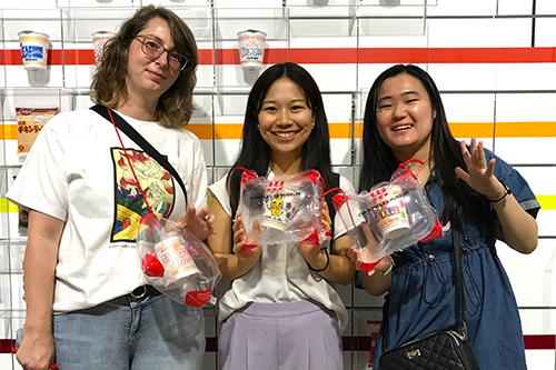 カップヌードルミュージアムでは、世界でひとつだけのオリジナル「カップヌードル」作りを体験しました。学生たちはカップにヒヨコなどオリジナリティ溢れる絵を描き、その後4種類の中からお好みのスープと、12種類の具材の中から4つのトッピングを選んで、シュリンクラップしてもらいます。最後に自分で風船のようなパッケージにカップヌードルを入れて、手動のエアーポンプで空気を入れます。赤いひもを通して結んだら完成!みんなでお互いに見せ合い、大変楽しめた様子でした。