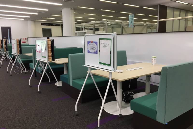 - 機器類:プロジェクター(常設・1台×2ブース)/ビックパッド(大型ディスプレイ)(常設・1台×4ブース)/壁面ホワイトボード(常設)/電子黒板キット(貸出・ホワイトボード専用)/ノートパソコン(貸出) 等