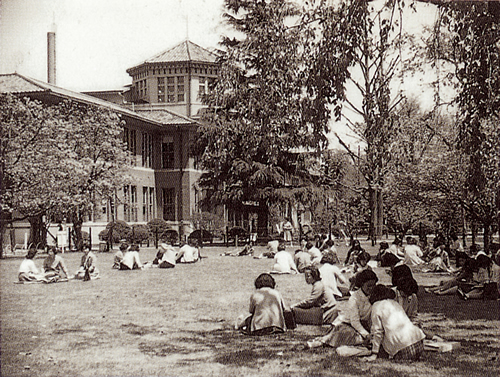 Talking on the lawn in front of the James Hall on the Imadegawa Campus. Eiko-kan can be seen in the back of the photo. Currently there is an underground library at this location.