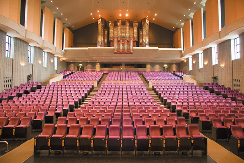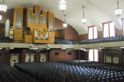 Daily worship services have been held at our university since the beginning, continuing to the present day. On the left is the Fowler Chapel in the Eiko-kan of the Imadegawa Campus, which can accommodate 1,600 people. On the right is a large hall with a capacity of 900 people in the Neesima Memorial Auditorium on the Kyotanabe Campus. Both are equipped with a splendid pipe organ, creating a magnificent atmosphere during worship.