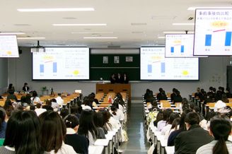 学生たちは、4年間の学業の集大成として、1年間にわたり各自の研究テーマについて取り組んだ成果を、スライド投影を用いて口頭発表しました。参加した1~3年次生・大学院生も長時間に渡る発表を熱心に聞いていました。
