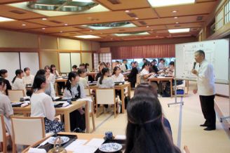 当日は、「洋食と和食」「懐石と会席」の違いに始まり、和食の源流や献立の意味、会席料理の流れ、料理や器の扱い方などについて丁寧にご説明をいただきました。また、訪問時の上座・下座の位置関係や履物の脱ぎ方、ふすまの開け方など、社会人として身につけておきたい基本的なマナーについても学びました。