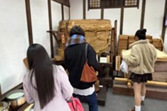 また酒造業の成り立ちと今日の成り立ち、伏流水の特質を考えるために御香宮神社、月桂冠大倉記念館を訪問しました。酒造の仕組みから樽の構造まで解説を伺いながら、なぜ伏見が全国有数の日本酒生産地たりえたのか、その立地と流通の側面から考察を行いました。さらに、そうした製造品を大坂や江戸に運搬するために重要であった伏見港についても理解を深めるために、船宿の寺田屋にみられる港湾史跡の見学などを通して港湾の歴史を学ぶ機会となりました。