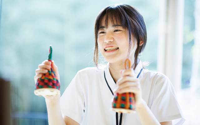 もともと私はかなりの人見知りで、人とかかわることが苦手でした。そんな私を変えてくれたのが、音楽学科の先生方。「何よりも人に寄り添うことが大切。技術は後からついてくる」という先生の言葉に、音楽療法への向き合い方が変わったように思います。とはいえ、いきなり人前で話したり演奏したりすることが得意になったわけではなくて、そういった部分は実習とボランティアに参加することで徐々に克服してきました。音楽学科は先生との距離が本当に近くて、ボランティア先などもたくさん紹介してくださいますし、悩むことがあれば面談などを丁寧に行ってくださいます。学生に細やかに向き合い、心を変えるような学びを与えてくれる先生方がいたからこそ、音楽療法士としての今の私があるのかなと思っています。